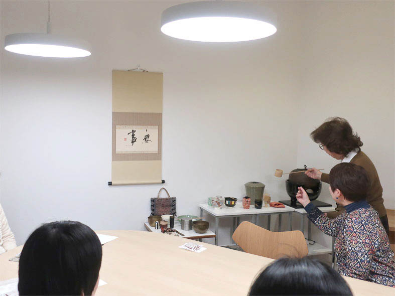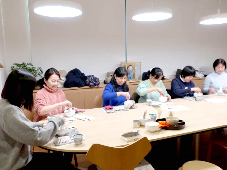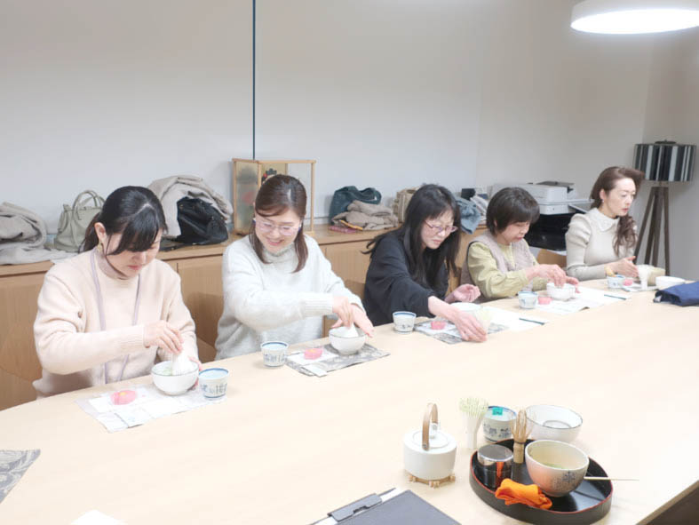 点て方のレクチャーの後、参加者の方にご自身のお抹茶を点てていただきました。お茶請けのお菓子は、1時半の回が晩年の町子がアトリエでの休憩中にいただいていた北島の丸ぼうろと、3時の回が町子が買い物帰りに立ち寄りお土産にしていた赤坂のとらやの羊羹製の生菓子です。